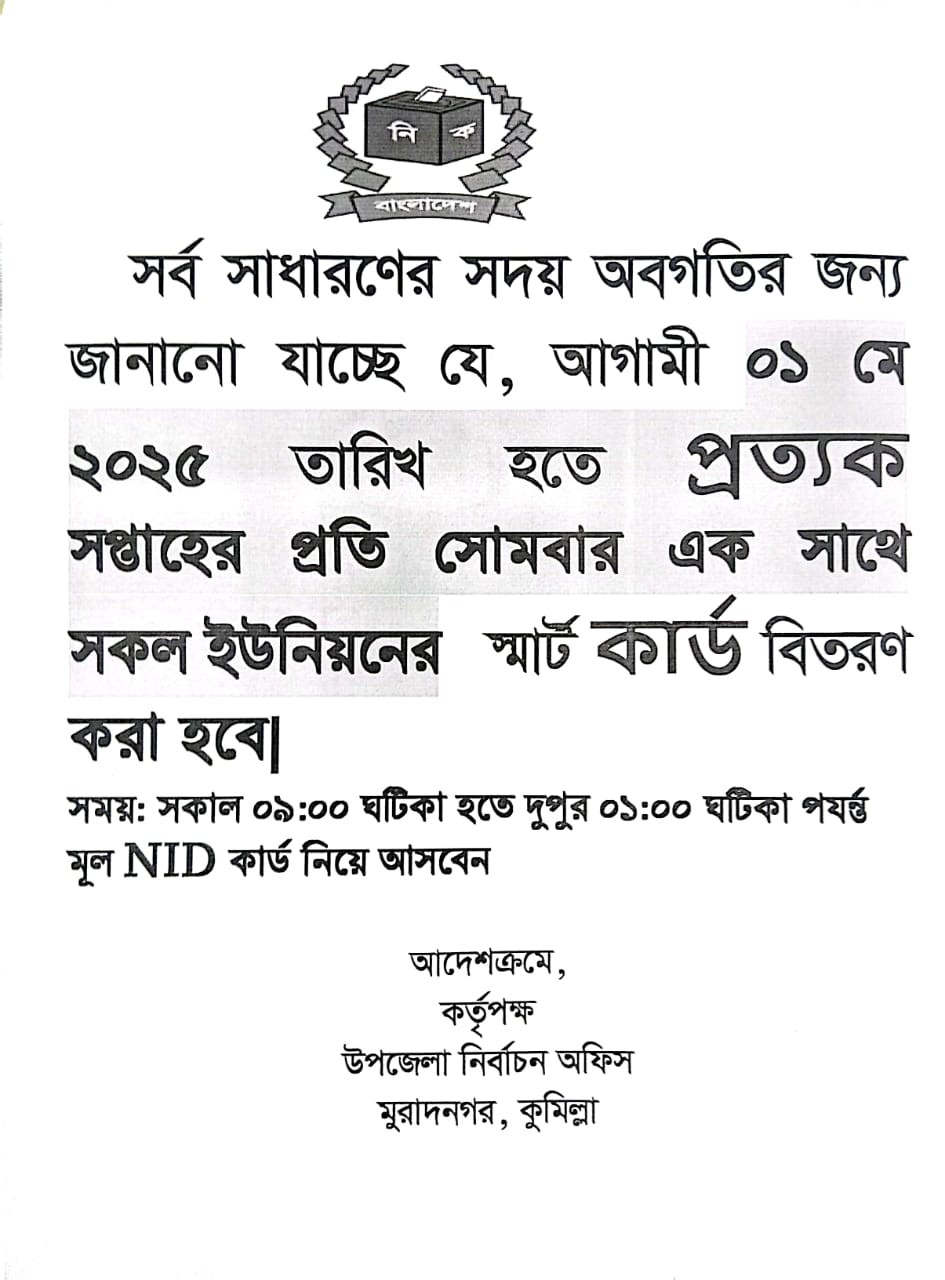 | ১ | সর্ব সাধারণের অবগতির জন্য জানানো যাচ্ছে যে, আগামী ০১ মে ২০২৫ ইং তারিখ হতে প্রত্যক সাপ্তাহের প্রতি সোম বার এক সাথে মুরাদনগর উপজেলার সকল ইউনিয়নের স্মার্ট কার্ড বিতরণ করা হবে। সময় সকাল ৯ ঘটিকা হতে দুপুর ১ ঘটিকা পযর্ন্ত। মূল NID কার্ড সাথে আনতে হবে। | | দেখুন |